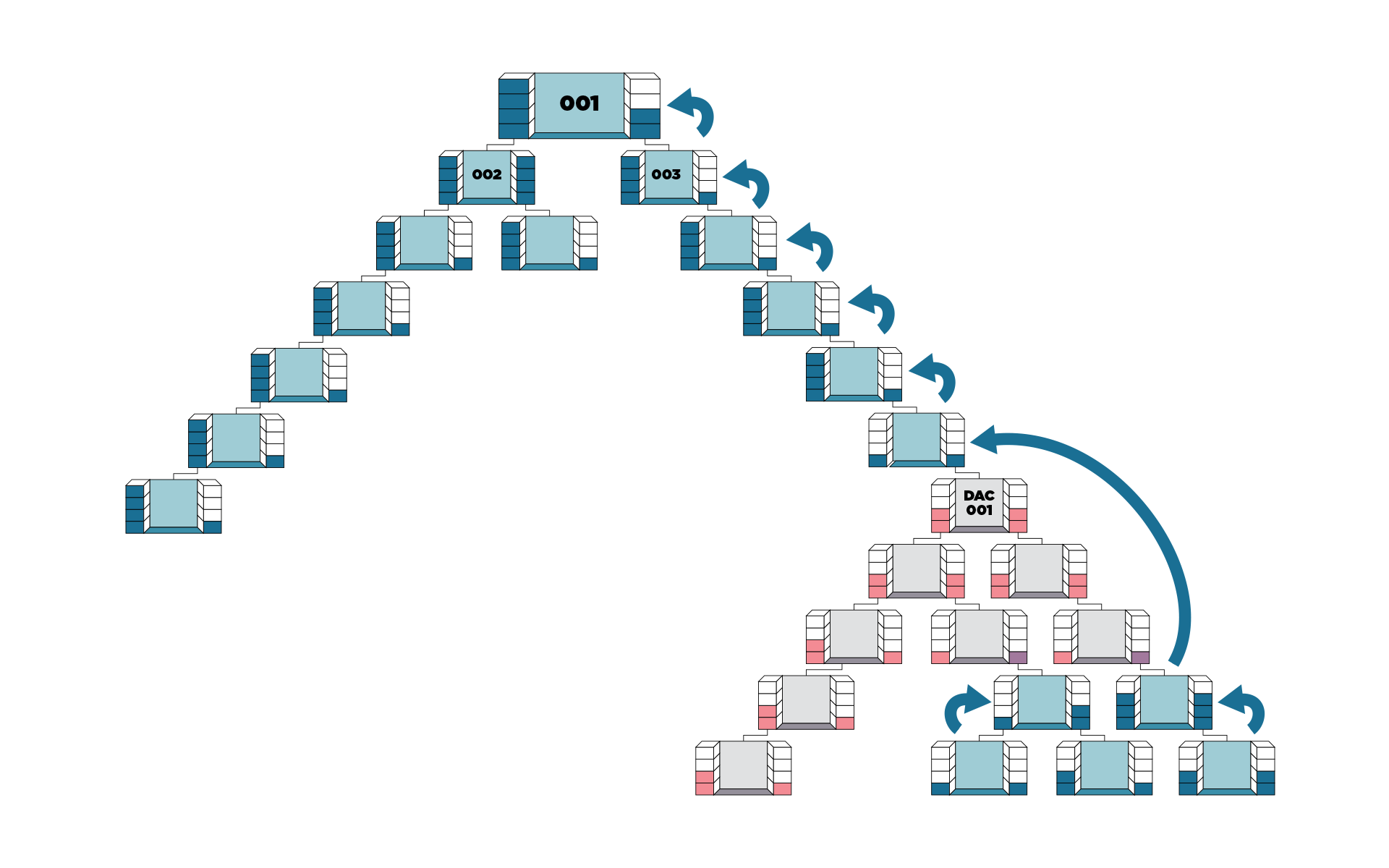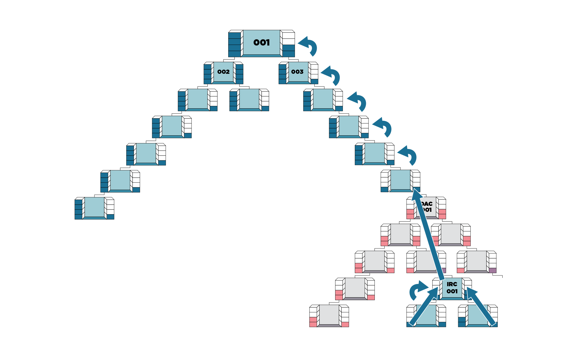 BV累積:累積在IRC的BV在本區域組織内的連接點轉為本區域的BV,並由此向上流動。這些由IRC轉來的BV與本區域的BV合併後,一起沿著組織網路向上累積。這些點數會累積在本區域的各個合格商業發展中心。請看下面的圖示: